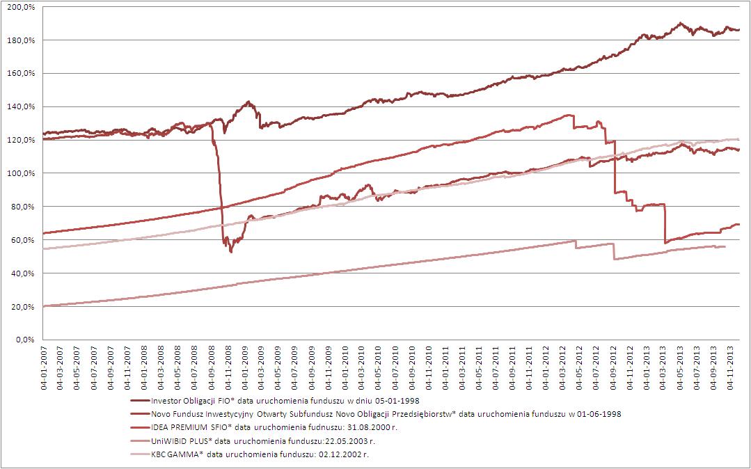 Rys.1 Zachowanie jednostek funduszy dla zdarzeń kredytowych przy wycenie IRR, obliczenia własne – dane za okres 04.01.2007 – 09.12.2013.