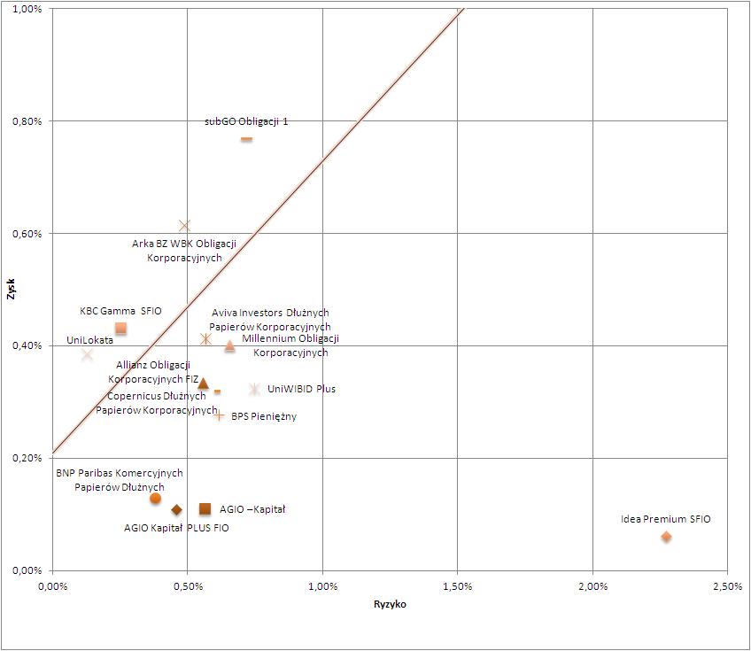 Rys.2 Mapa ryzyko/zysk miesięcznych stóp zwrotu jednostek funduszy obligacji korporacyjnych oraz linia oddzielająca średnie stopy zwrotu dla danego poziomu ryzyka od średniej rynkowej - obliczenia własne.