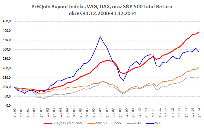 Według danych firmy analitycznej Preqin monitorującej ponad 8 300 funduszy private equity o łącznych aktywach 4,6 biliona USD, indeks odzwierciedlający najpopularniejszą strategię private equity, tj. buyout wzrósł w okresie 2000-2014 prawie czterokrotnie – znacznie więcej niż indeksy rynku akcji.