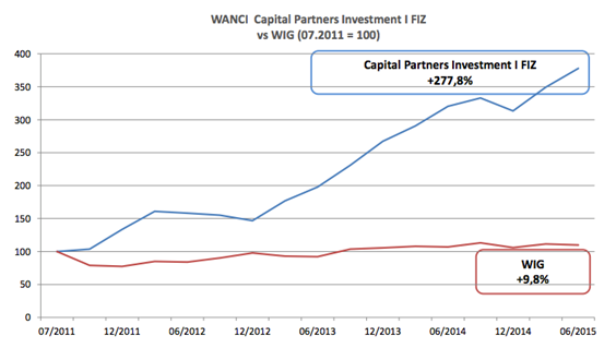 Inwestując w 2011 roku w fundusz Capital Partners Investment I FIZ kwotę 100 000 zł, po czterech latach na 30 czerwca 2015 ich wartość to już 377 800 zł. W tym samym czasie kwota ta zainwestowana w polski rynek akcji (WIG) przyniosła tylko 109 800 zł.