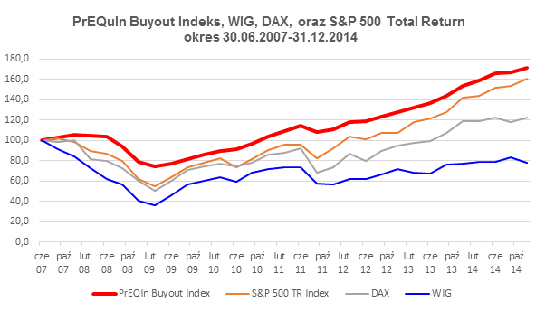 Od 30 czerwca 2007 (szczyt hossy na giełdach) do końca 2014 indeks PrEQIn Buyout, również dostarczył najwyższych stóp zwrotu. W tym okresie szczególnie słabo zachowywał się polski rynek akcji, który na koniec 2014 miał wartość ponad 20% niższą niż w szczycie hossy.