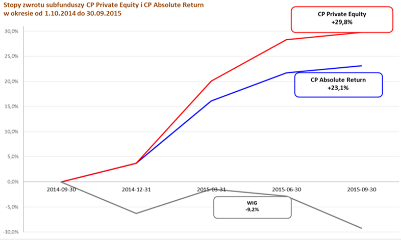 Udowodniliśmy, że wiedza, doświadczenie i wyczucie naszego zespołu przynoszą realne zyski dla inwestorów. W ciągu roku działalności Fundusz wypracował odpowiednio +29,8% w subfunduszu CP Private Equity oraz +23,1% w subfunduszu CP Absolute Return, pomimo tego, że indeks WIG spadł o ponad 9%.