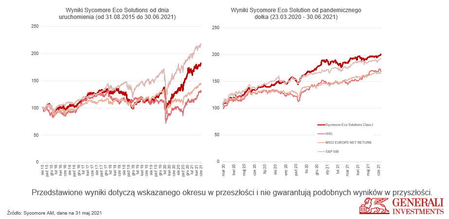 Taki strukturalny popyt jest już widoczny i przekłada się na wyniki funduszy inwestujących w duchu ESG, w tym Sycomore Eco Solutions (grafika poniżej). Perspektywy funduszu Generali Akcji Ekologicznych są zatem bardzo obiecujące.