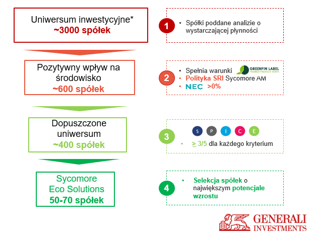 Starannie wyselekcjonowane przy zastosowaniu filtra ekologicznego spółki, przechodzą następnie przez proces oceny według wewnętrznego, będącego własnością intelektualną Sycomore AM, systemu SPICE. SPICE to zintegrowana analiza podejścia spółki do 5 obszarów: społeczeństwo i dostawcy (Society & Suppliers), ludzie (People), inwestorzy (Investors), klienci (Clients), środowisko (Environment), bazująca na przekonaniu, że firma może tworzyć długoterminową zrównoważoną wartość tylko wtedy, gdy wartość ta jest dzielona ze wszystkimi jej interesariuszami.
