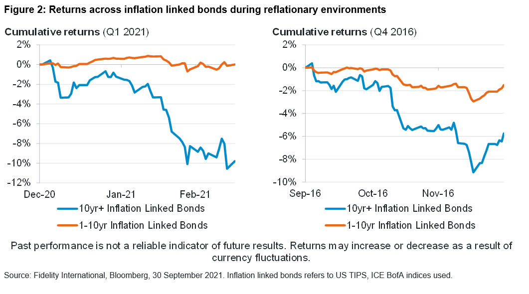 W ciągu ostatnich pięciu lat istniały dwa kluczowe środowiska reflacyjne. W czwartym kwartale 2016 r., kiedy Donald Trump został wybrany na prezydenta USA oraz w pierwszym kwartale tego roku. W obu przypadkach obligacje powiązane z inflacją o krótszych terminach zapadalności radziły sobie lepiej niż ich odpowiedniki o dłuższych terminach.