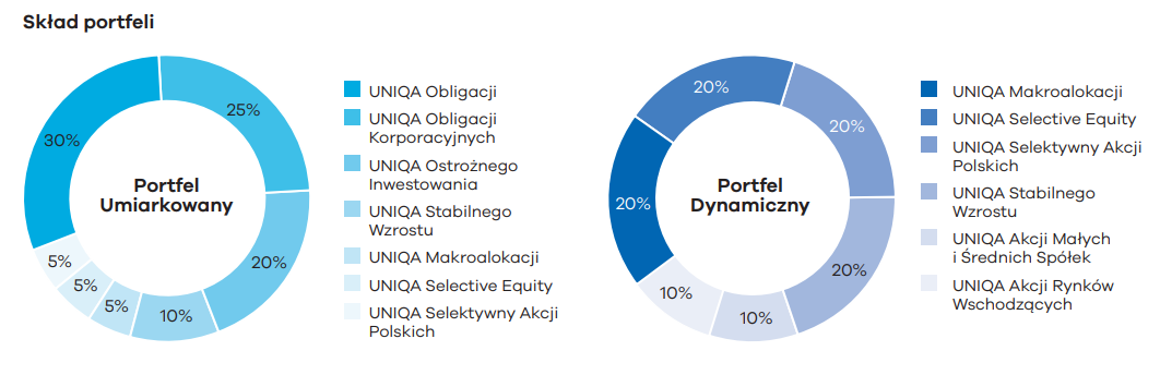 Za pomocą programu UNIQA PIRO inwestujesz w jednostki funduszy inwestycyjnych, wybierając spośród dwóch portfeli: dynamicznego i umiarkowanego. Portfel dynamiczny został przygotowany z myślą o inwestorach, którzy skłonni są ponieść wyższe ryzyko inwestycyjne. Główną grupę aktywów w tym portfelu stanowią akcje. Dla osób z niższą skłonnością do ponoszenia ryzyka UNIQA przygotowała portfel umiarkowany, który składa się w największym stopniu z obligacji.