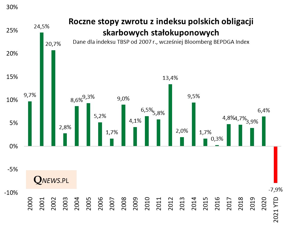 Jednocześnie mijający rok okazał się bolesny dla portfeli obligacji skarbowych, szczególnie tych z dużym udziałem obligacji o stałym oprocentowaniu. Konieczność dostosowania się ich rentowności do podwyżek stóp procentowych wymusiła silną przecenę. Po raz pierwszy w dostępnej nam historii danych indeksy obligacji stałokuponowych kończą rok ze stratą. Ale jest też druga strona medalu – w zamian za to średnia rentowność papierów podskoczyła z poziomu bliskiego zeru na początku roku do ok. 3 proc. obecnie, co lepiej rokuje na przyszłość.