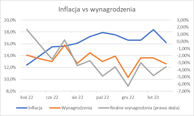 Dane o inflacji i wynagrodzeniach za ostatnie 12 miesięcy, które prezentuje GUS pokazują, że od maja ubiegłego roku (z wyjątkiem lipca) inflacja przekracza tempo wzrostu wynagrodzeń. To oznacza, że realne dochody spadaja, a warto pamietać, że te dane o wynagrodzenaich dotyczą firm, które zatrudniają ponad 9 osób, gdzie tempo wzrostu wynagrodzeń zazwyczaj jest wyższe niż w całej gospodarce. Efekt spadku realnych dochodów właśnie wpływa na poziom konsumpcji.