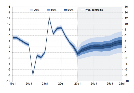 Ostatnio projekcja NBP zakłada, że w tym roku wzrost gospodarczy (w najbardziej prawdopodobnym scenariuszu wyniesie 0,9%, a 3% przekroczy w 2025 roku).