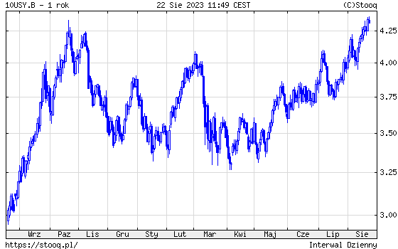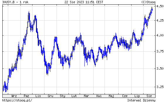Zacznijmy od amerykańskich obligacji skarbowych. Długoterminowe obligacje tracą na wartości, czyli ich rentowności rosną, pomimo spadającej inflacji i spodziewanego w tym roku zakończenia podwyżek stóp procentowych przez Fed (być może cykl podwyżek już został zakończony i przekonamy się o tym we wrześniu).