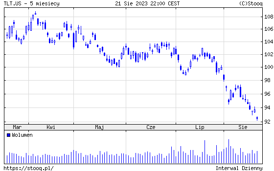 ETF iShares 20Y+ Treasury Bond, który inwestuje w długoterminowe amerykańskie obligacje skarbowe z terminami wykupu powyżej 20 lat, stracił od pierwszej dekady kwietnia niemal 14%.