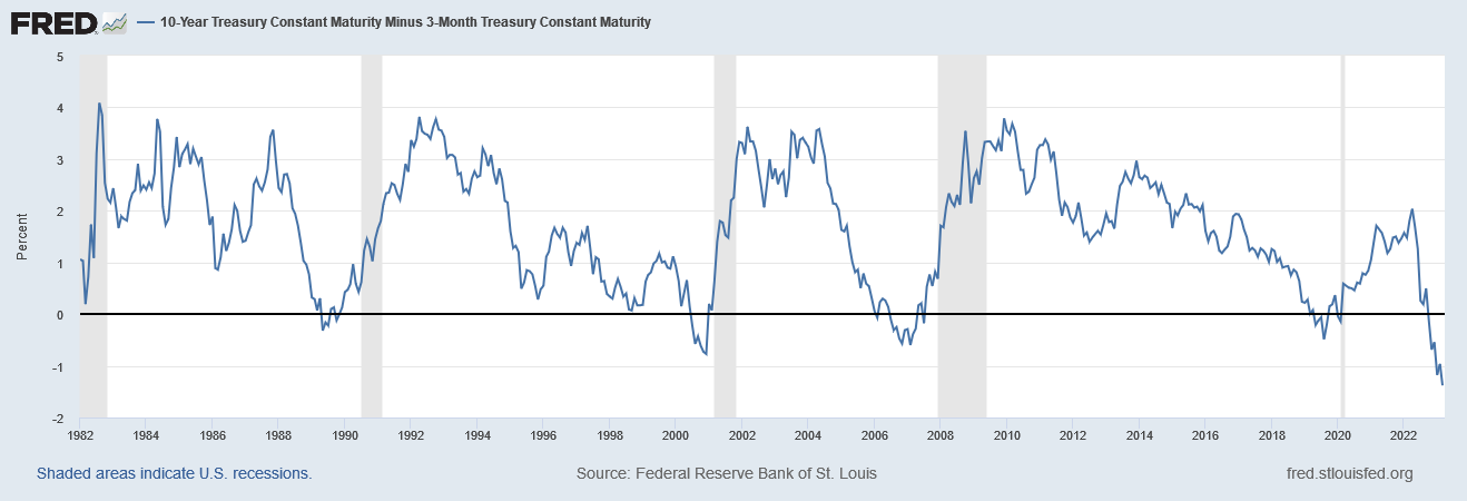 W maju różnica pomiędzy rentownością 10-letnich obligacji skarbowych i papierów 3-miesięcznych sięgała prawie -2% i w ciągu ostatnich 40 lat takiej sytuacji na rynku nie było.