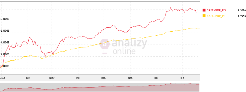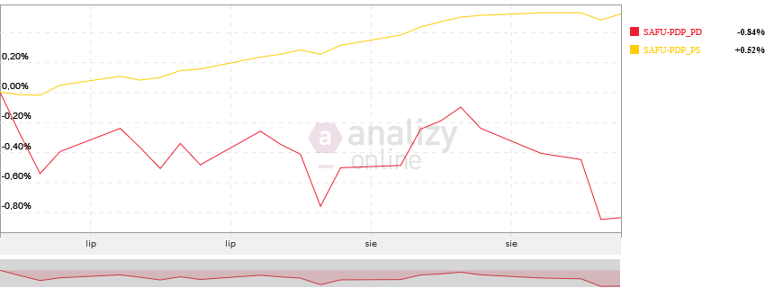 Od początku roku do 18 lipca, gdy wypadło minimum rentowności na rynku obligacji 10-letnich,średnia stopa zwrotu dla funduszy dłużnych polskich skarbowych długoterminowych (SAFU-PDP_PD) wyniosła +9,36% , a funduszy dłużnych polskich skarbowych (SAFU-PDP_PS) + 6,79%. W portfelach tych drugich funduszy jest znacznie więcej obligacji o zmiennym oprocentowaniu i jak widać, zmienność cen jednostki jest znacznie niższa.