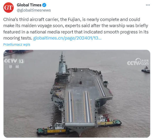 Chiny mają już w służbie dwa lotniskowce. Jeden kupiony od Rosji, drugi zbudowany przez Chiny, ale oba były lotniskowcami starszego typu. Nowy lotniskowiec jest wyposażony w katapulty elektromagnetyczne, takie jak zamontowane na amerykańskich superlotniskowcach klasy Gerald Ford. Chiński lotniskowiec czeka jeszcze sporo prób morskich, ale na koniec tego roku może być gotowy do służby. Pomimo że Tajwan leży tylko 200 kilometrów od wybrzeży Chin, to przy wprowadzeniu blokady Tajwanu, Chinom potrzebne byłyby co najmniej dwa lotniskowce. Najnowszy lotniskowiec jest zdolny do rywalizacji z najnowszymi konstrukcjami amerykańskimi, więc logicznym wydaje się, że Chiny poczekają ten rok potrzebny na testy nowego lotniskowca.