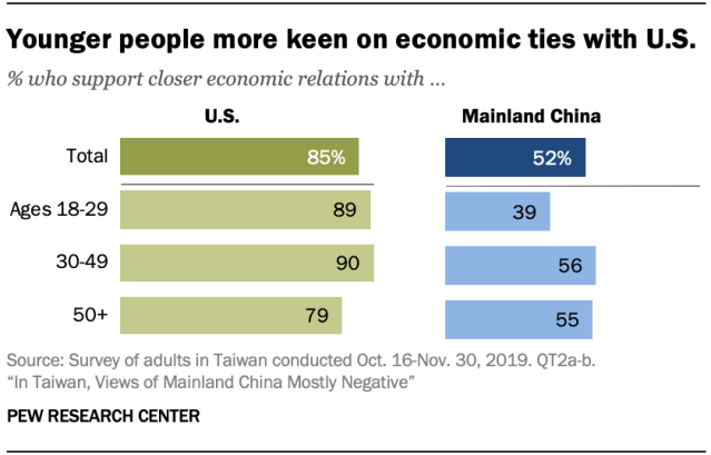Chiny chciałyby więc przejąć Tajwan pokojowo, dzięki postępującej integracji gospodarczej. Problem polega na tym, że chiński rząd widzi, że to się nie udaje. Tajwańskie społeczeństwo staje się coraz bardziej skłonne do integracji z USA, a nie z Chinami i procesy te postępują. Zwłaszcza młodzi ludzie „dali się” zamerykanizować. W grupie wiekowej 18-29 aż 89% Tajwańczyków chce zacieśnienia relacji z USA, a tylko 39% z Chinami.