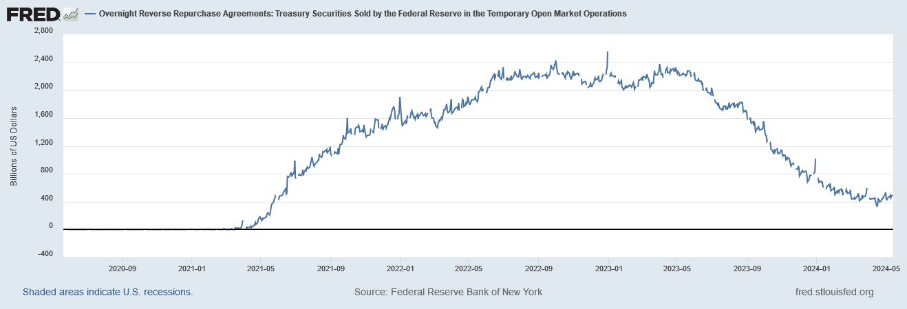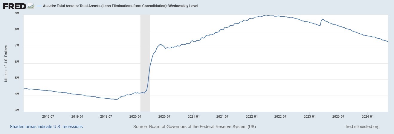 W szczycie w 2022 suma bilansowa Fed zbliżyła się do 9 bilionów dolarów. Od tego czasu zmniejszyła się o 1,6 biliona dolarów, a Fed wyprzedaje co miesiąc obligacje skarbowe o wartości 60 miliardów i obligacje hipoteczne o wartości 35 miliardów dolarów. Od czerwca skala wyprzedaży ma zostać zmniejszona. Fed zamierza sprzedawać obligacje skarbowe o wartości 25 miliardów dolarów miesięcznie.