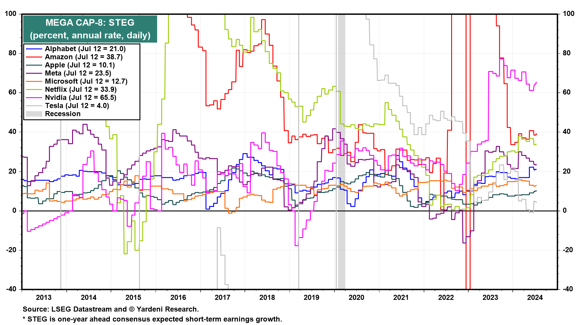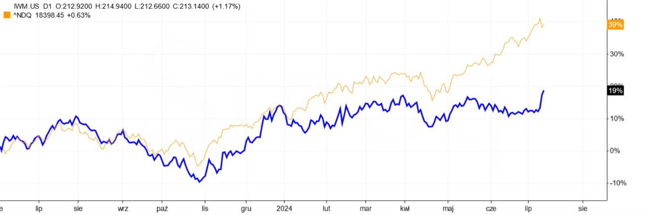 To, co zwraca uwagę, to różnica w tempie wzrostu Nasdaqa od początku roku i indeksu Russell 2000. Nasdaq rósł przede wszystkim dzięki największym spółkom i były ku temu powody. Natomiast obecnie oczekiwania rynkowe wyglądają nieco inaczej. Spodziewane tempo wzrostu zysków dla największych spółek jest nadal wysokie, ale dla małych spółek również wyższe.