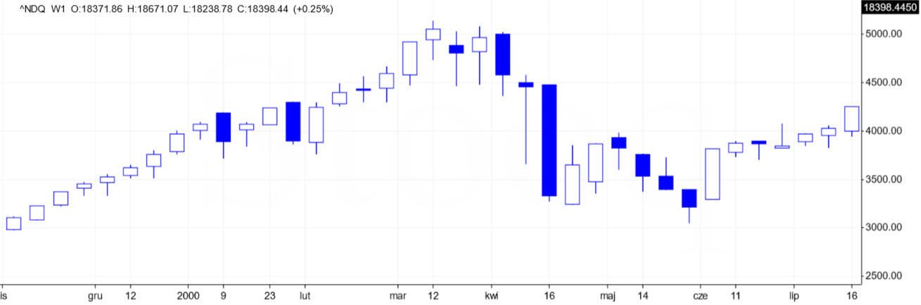 Na wykresie tygodniowym Nasdaqa z 2000 roku widać, że odwrócenie trendu zajęło 4 tygodnie.