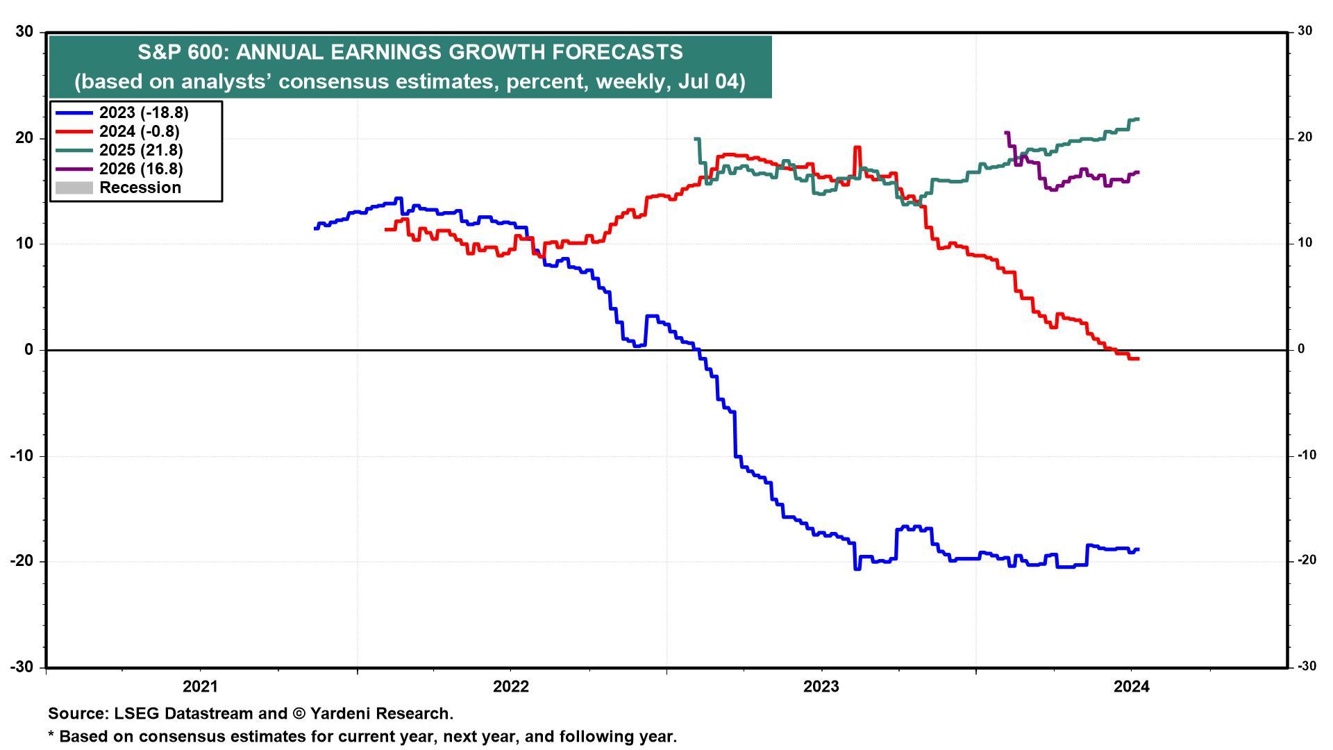 Dla indeksu S&P 600, który grupuje małe spółki, w tym roku nastąpi spadek zysku (linia czerwona). Natomiast prognozowany wzrost zysków na rok 2025 (zielona linia) rośnie i zbliża się już do 22%.
