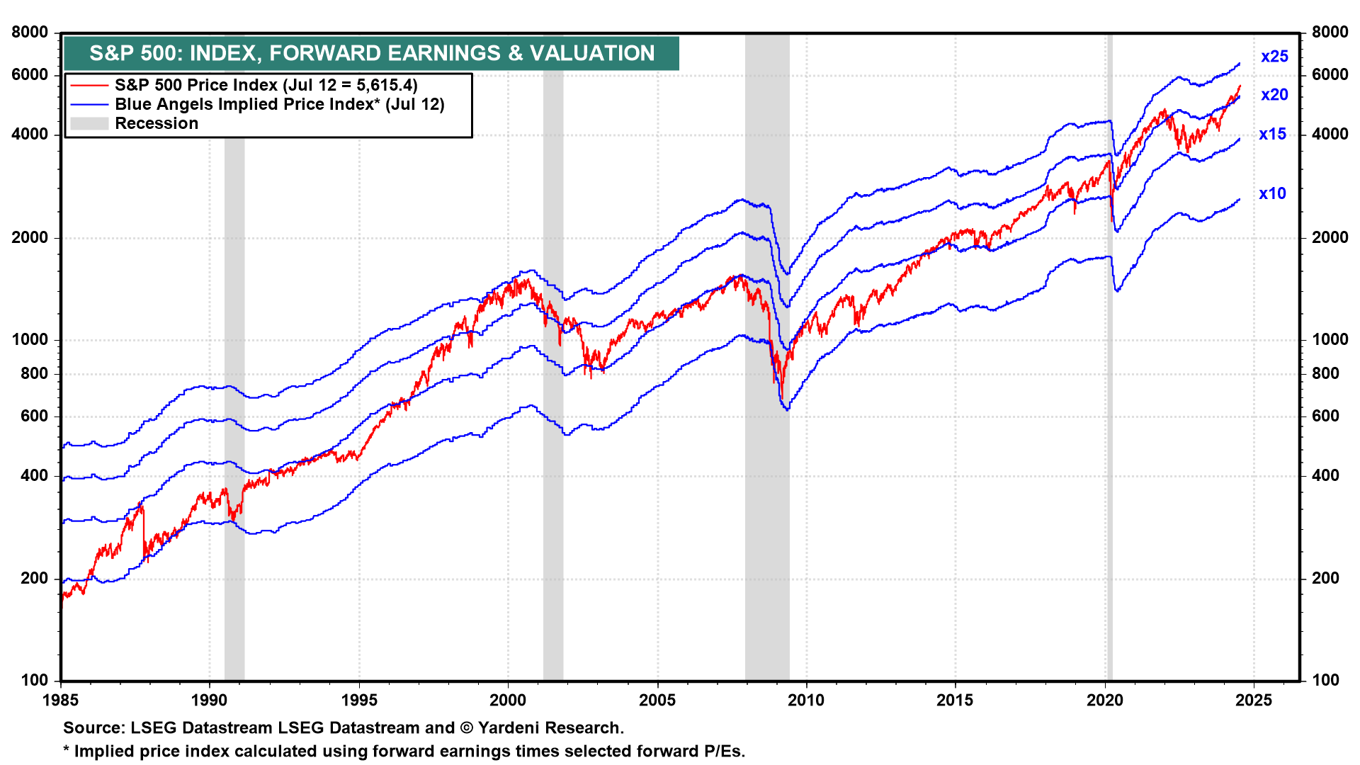 Oczekiwany wzrost zysków dla indeksu S&P 500 na obecny rok (linia fioletowa) przekracza 10%. Na rok 2025 (linia zielona) przekracza 14%.
