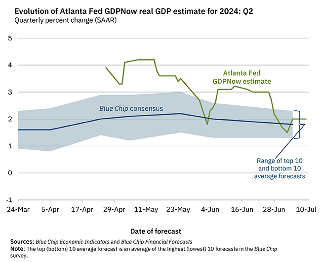 Model stworzony przez oddział Fed w Atlancie, który prognozuje wzrost gospodarczy, dla II kwartału tego roku obniżył się z 5% w maju do 2%. Ponieważ jest to wynik annualizowany, oznacza wzrost PKB kw./kw. o 0,5%. To nadal nie jest mało, ale liczy się tendencja. Gospodarka spowalnia.