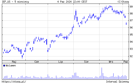 ETF ISHARES 7-10Y TREASURY BOND inwestujący w amerykańskie obligacje skarbowe o stałym oprocentowaniu i terminach zapadalności pomiędzy 7 i 10 lat w ciągu trzech tygodni stracił 2,7%, w tym tylko w piątek 0,96%.