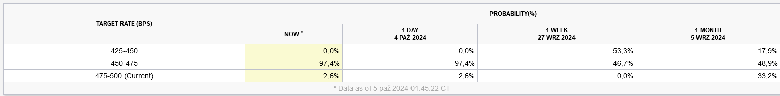 Taki odczyt spowodował, że oczekiwania na obniżki stóp w tym roku zdecydowanie się obniżyły. Na stronie Chicago Mercantile Exchange (CME) możemy znaleźć informację, że po zakończeniu piątkowej sesji rynek wyceniał obniżkę o 25 punktów bazowych na listopadowym posiedzeniu z prawdopodobieństwem 97,4%. Natomiast tydzień wcześniej prawdopodobieństwo takiej obniżki wynosiło 46,7%, natomiast obniżka o 50 punktów bazowych wyceniana była na 53,3%.
