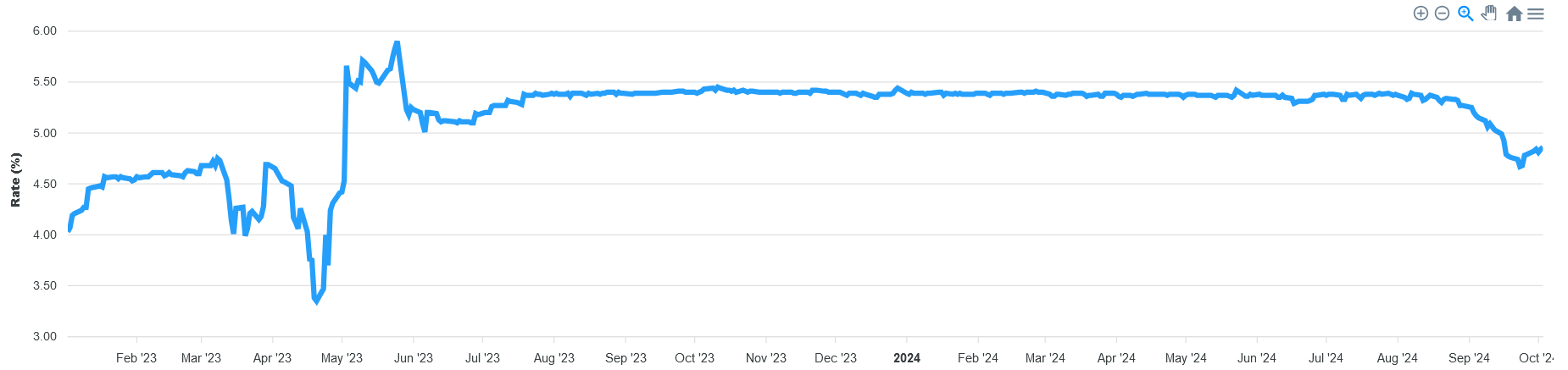 Jeżeli rozważamy inwestycję w fundusz, który w portfelu ma długoterminowe obligacje, albo taki, który ma krótkoterminowe obligacje, to oprócz ryzyka zmienności warto spojrzeć na rentowności obligacji o różnych terminach zapadalności. To pokaże nam, jakich stóp zwrotu możemy spodziewać się, gdyby poziom rentowności nie zmienił się w długim okresie. W USA jeszcze w lipcu 4-tygodniowy bon skarbowy miał rentowność 5,39% (liczoną w skali roku). Obecnie rentowność spadła do 4,86%.