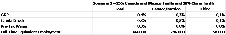 Tax Foundation, czyli organizacja śledząca zmiany podatkowe zarówno w USA, jak również w Europie, szacuje, że po wprowadzeniu ceł w wysokości 25% na towary z Meksyku i Kanady oraz 10% na towary z Chin wzrost gospodarczy w USA obniży się o 0,4%. Warto jednak zaznaczyć, że ta prognoza zakłada brak ceł odwetowych ze strony krajów, na które Trump nakłada cła. Jeżeli ceł odwetowych nie będzie, to gospodarka amerykańska odczuje jedynie niewielkie obniżenie tempa wzrostu gospodarki i przejściowy wzrost inflacji. Według Tax Foundation spadek PKB po wprowadzeniu ceł w USA wyniesie 0,4%, w Kanadzie i Meksyku ok. 0,3% i 0,1% w Chinach. Cła doprowadzą również do spadku zatrudnienia.