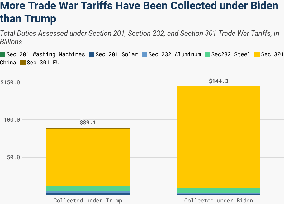 Inaczej będzie w sytuacji, gdy pojawią się cła odwetowe. Wówczas wpływ na gospodarki tych krajów będzie wyższy, a także istnieje ryzyko rozwinięcia się globalnej wojny celnej, która odbije się na wzroście PKB na świecie. Jak duże mogą to być straty? Warto zacząć od tego, że wojnę handlową z Chinami rozpoczął Trump w czasie swojej pierwszej kadencji, ale to za prezydentury Bidena USA zebrały więcej z ceł niż za prezydentury Trumpa.