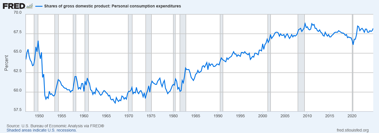 Obecnie przekracza 68%. W Polsce konsumpcja również przekracza 60% PKB, ale jej znaczenie dla gospodarki światowej jest znacznie mniejsze. Równocześnie mamy wysoki poziom wymiany handlowej, co bardziej upodabnia nas do gospodarki niemieckiej.