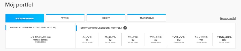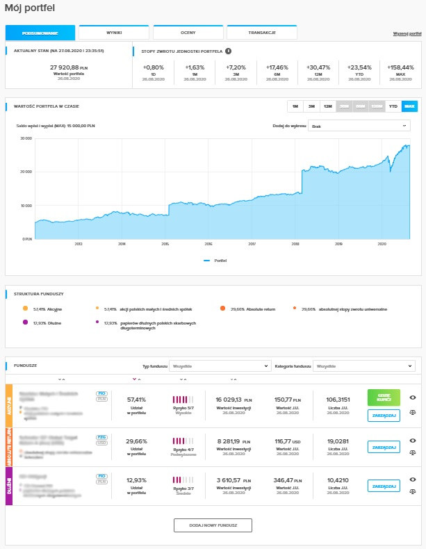My jednak zrobimy tak, aby mieć portfel składający się z trzech funduszy z jedną transakcją nabycia. Warto w tym miejscu wspomnieć, że w naszym portfelu inwestycyjnym możemy mieć jednocześnie maksymalnie 30 aktywnych funduszy, przy czym historycznie może ich być nieograniczenie wiele.W naszym przykładzie pierwszy fundusz pojawił się w 2012 roku (zainwestowana kwota to 5000 zł), a kolejne fundusze dokładane były do portfela mniej więcej co trzy lata (początkowa kwota kolejno 3000 zł i 7000 zł). Po stworzeniu takiego portfela naszym oczom ukaże się jego profil złożony z głównej belki, z której odczytamy stopy zwrotu jednostki portfela w różnych przedziałach czasu i aktualny stan wirtualnego rachunku: