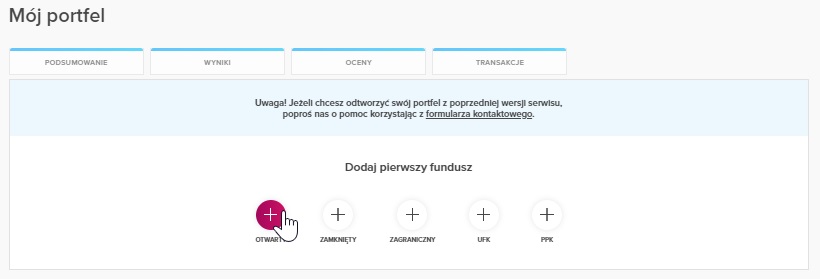 Żeby zacząć tworzyć portfel inwestycyjny, trzeba się zalogować, a następnie z rozsuwanej listy wybrać poniższą opcję:Po kliknięciu naszym oczom pokaże się ekran z możliwością dodania pierwszych funduszy do portfela. Załóżmy, że chcemy skonstruować prosty portfel funduszy polskich i zagranicznych. Fundusze dodajemy klikając „+”.