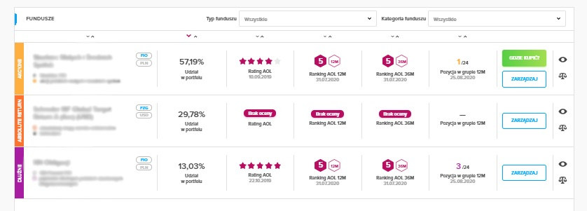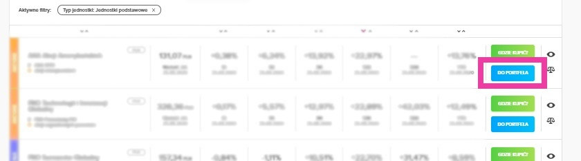 Wybierzmy więc dwa przykładowe otwarte fundusze akcji i obligacji z oferty polskich TFI. Najpierw szukamy na liście funduszy tych strategii, które nas interesują (możemy skorzystać z filtrów wyszukiwania funduszy), a następnie klikamy po prawej stronie niebieski guzik „DO PORTFELA”.