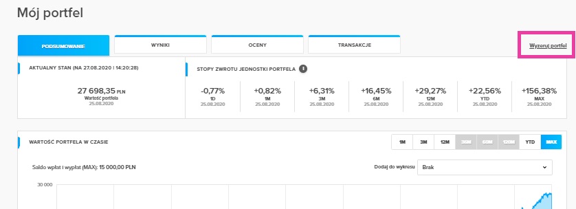W każdym momencie możemy usunąć nasz portfel i rozpocząć budowę na nowo. Wystarczy kliknąć „wyzeruj portfel” w prawym górnym rogu ekranu.