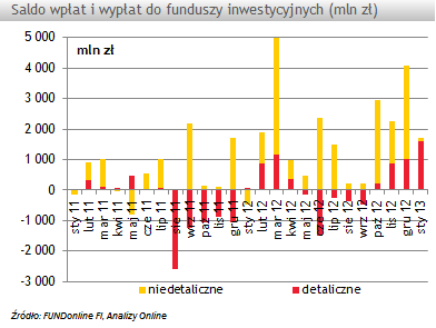 Łączny bilans sprzedaży wyniósł +1,7 mld zł i był ponad dwukrotnie niższy niż miesiąc wcześniej. Gros pozyskanych środków trafiło do funduszy detalicznych, czyli dedykowanych przede wszystkim inwestorom indywidualnym. W ich przypadku, saldo wpłat i wypłat wyniosło +1,6 mld zł, co było najwyższą wartością od ponad 5 lat. Dla porównania, w całym minionym roku napływ środków do funduszy detalicznych wyniósł +1,3 mld zł. Styczniowy bilans sprzedaży funduszy niedetalicznych, czyli skierowanych do grupy wybranych inwestorów wyniósł +0,1 mld zł i było najniższy od 12 miesięcy.