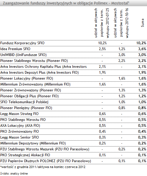 Przed wnioskiem o upadłość PBG, obligacje wyemitowane przez Polimex-Mostostal, były drugimi najczęściej wykorzystywanymi przez fundusze inwestycyjne, papierami wyemitowanymi przez spółkę z sektora budowlanego. Papiery, które zapadają w lipcu i październiku br., są widoczne w portfelach 21 funduszy (wg sprawozdań finansowych z końca 2011 roku). Według naszych szacunków największe udziały papierów Polimeksu-Mostostal może posiadać Fundusz Korporacyjny SFIO (zarządzany przez Legg Mason TFI), w którym mogą one stanowić ok. 10% portfela. W aktywach funduszu Idea Premium SFIO obligacje te mogą stanowić ponad 3%.