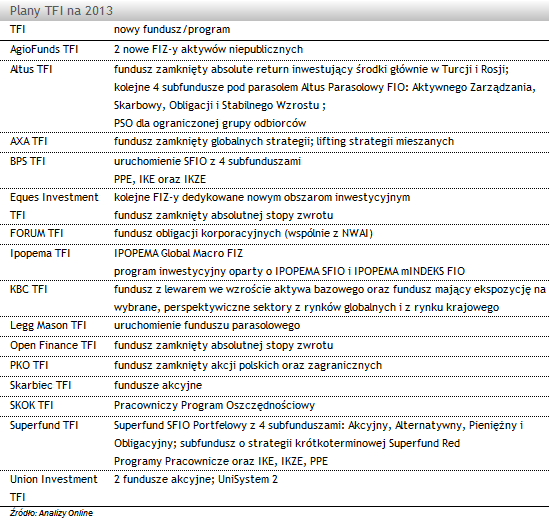 Od wielu miesięcy widoczny jest trend tworzenia produktów dla węższego grona odbiorców. Nie inaczej będzie w przyszłym roku. Wśród nowości dominują fundusze mające zarabiać w każdych warunkach rynkowych, czyli absolutnej stopy zwrotu. Już na przełomie stycznia i lutego fundusz total return ma się pojawić w Ipopema TFI (Ipopema Global Macro FIZ). W Altus TFI powstanie fundusz tego typu wykorzystujący potencjał rynku tureckiego i rosyjskiego, którym będzie zarządzać specjalista z Londynu. Union Investment TFI przygotuje drugą wersję UniSystem, będącą kopią UniSystem 1, z tym że z mniejszym ryzykiem inwestycyjnym. Fundusze zamknięte absolutnej stopy zwrotu uruchomi także Open Finance TFI oraz Eques Investment TFI. AXA TFI pracuje nad funduszem zamkniętym globalnej strategii, a PKO TFI chcąc wykorzystać dobrą koniunkturę na rynkach akcji, zaproponuje swoim klientom fundusz zamknięty akcji polskich oraz globalnych. Z kolei AgioFunds TFI pracuje nad 2 FIZ-ami związanym z rynkiem niepublicznym.