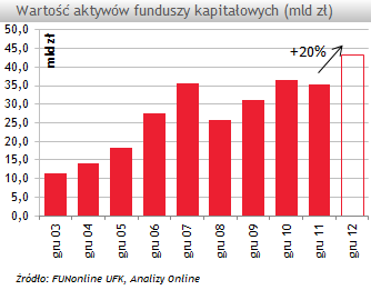 Dobra koniunktura na giełdach w drugiej połowie 2012 r., sprzyjała funduszom akcyjnym. Aktywa w nich zgromadzone zyskały na wartości w ciągu roku ponad +1,6 mld zł, czyli +19%, kończąc rok na poziomie 10 mld zł. Do wzrostu wartości aktywów przyczyniły się głównie wyniki zarządzania (ok. 1 mld zł) oraz dodatni bilans sprzedaży, który wyniósł +0,5 mld zł. Klienci preferowali fundusze akcji uniwersalnych, w przypadku których przewaga wpłat nad wypłatami przekroczyła +0,3 mld zł.