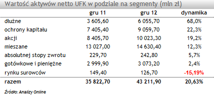 Największym segmentem rynku pozostają fundusze mieszane. Ich aktywa wzrosły o +12% w 2012 r. do 14 mld zł. To w głównej mierze zasługa dobrych wyników zarządzania. Bilans sprzedaży rozwiązań mieszanych oferowanych przez ubezpieczycieli wyniósł niecałe +0,2 mld zł. Jedyną grupą, która zanotowała spadek aktywów netto w 2012 r. są fundusze surowcowe, posiadające jednocześnie najmniejszy udział w rynku UFK.