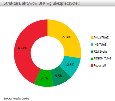 Na 24 ubezpieczycieli działających na polskim rynku aż 19 zwiększyło wartość zarządzanych środków w 2012 roku. Wśród trzech towarzystw, które posiadały co najmniej 10% udział w rynku przed rokiem, aktywa wzrosły w ING TUnŻ i Aviva TUnŻ (odpowiednio o +22% i +10%). Pierwsze towarzystwo zamknęło rok z dodatnim bilansem sprzedaży, wynoszącym +0,4 mld zł. W tym czasie Aviva TUnŻ zanotowała odpływ środków netto przekraczający -0,1 mld zł. Z pierwszej trójki jedynie AEGON TUnŻ zanotował spadek aktywów o -3,4%, spowodowany m.in. ujemnym saldem wpłat i wypłat (-0,2 mld zł). W efekcie udział w rynku towarzystwa spadł poniżej 10%. Na trzecie miejsce pod względem wielkości aktywów awansowało PZU Życie.