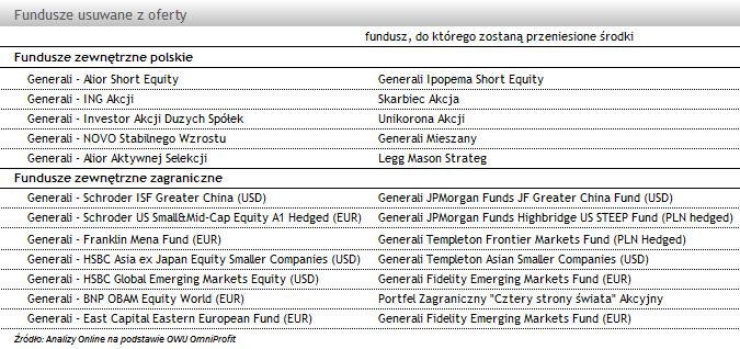 Zmiany w ofercie funduszowej polegały również na usunięciu kilkunastu rozwiązań. Ci, którzy mają w nich ulokowane środki, mają 3 miesiące na ich przeniesienie. Jeśli tego nie uczynią, Generali przetransferuje środki do funduszy o najbardziej zbliżonej polityce inwestycyjnej.