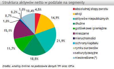 Rozchwiana koniunktura najbardziej sprzyjała segmentowi funduszy dłużnych, które odnotowały najwyższą w bieżącym roku dynamikę wzrostu aktywów. Środki w nich zgromadzone powiększyły się aż o +1,2 mld złotych osiągając wartość 38,7 mld złotych. Oprócz pozytywnego wyniku zarządzania, decydującym czynnikiem okazał się napływ nowych środków. W rezultacie wzrost aktywów odnotowały wszystkie główne grupy w ramach tego segmentu. Aktywa rosły zarówno wśród rozwiązań o uniwersalnej strategii, czy też funduszy skarbowych, ale także w grupie obligacji przedsiębiorstw i w funduszach obligacji zagranicznych. Obok funduszy dłużnych znaczący wzrost aktywów odnotowały fundusze pieniężne i gotówkowe. W ich przypadku wzrost aktywów wyniósł ponad +0,6 mld złotych. Dzięki temu ich poziom osiągnął 24,4 mld złotych.