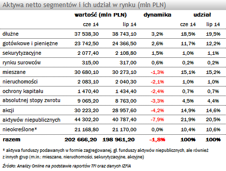 Największy spadek zgromadzonych środków, poza funduszami aktywów niepublicznych, odnotowały fundusze akcyjne. W ich przypadku zadecydował zarówno ujemny wynik zarządzania jak i negatywny bilans sprzedaży. Warto zwrócić uwagę, że wchodzące w ich skład fundusze akcji zagranicznych odnotowały niewielki wzrost. Mogło mieć to związek z nierówną koniunkturą na rynkach akcji, gdyż aktywa funduszy akcji zagranicznych są w mniejszym stopniu uzależnione od warszawskiej giełdy, na której w obliczu negatywnych informacji wzrost indeksów był praktycznie niemożliwy. W lipcu ważyły się losy OFE – ostatecznie chęć pozostania zadeklarowało ponad 2,2 mln osób. Z czynników zewnętrznych decydujący wpływ miały obustronne sankcje gospodarcze na linii Unia Europejska i USA – Rosja, które przesądziły o przecenie na warszawskim parkiecie. Pod presją słabych wyników znalazły się również aktywa funduszy mieszanych oraz absolutnej stopy zwrotu. W pierwszym przypadku ich poziom zmniejszył się - 0,4 mld złotych do 30,3 mld złotych. W drugim o -0,3 mld złotych do 8,8 mld złotych.