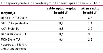 Udany rok mają za sobą jeszcze Generali Życie TU oraz PKO Życie TU, w przypadku których saldo wpłat i wypłat wyniosło prawie +0,4 mld zł. Klienci pierwszej z wymienionych instytucji w 2014 r. inwestowali głównie fundusze o niskim poziomie ryzyka. Najwięcej, ponad +60 mln zł pozyskał Generali Gwarantowany UFK, a ponad +30 mln zł trafiło do Generali Obligacji UFKGenerali - UniObligacje Aktywny UFK oraz Generali - Arka BZWBK Obligacji Skarbowych UFK.
