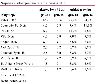 Miniony rok przyniósł dość istotną zmianę w gronie największych instytucji na rynku UFK. Ponad +1,5 mld zł bilans sprzedaży umożliwił Open Life TU Życie awans z czwartej na drugą pozycję pod względem wielkości zgromadzonych aktywów z prawie 12% udziałem w rynku. To jedyna większa zmiana w czołówce. Największym graczem na rynku UFK pozostaje Aviva TUnŻ, z aktywami netto wartymi 12,4 mld zł i ponad 23% udziałem w rynku.