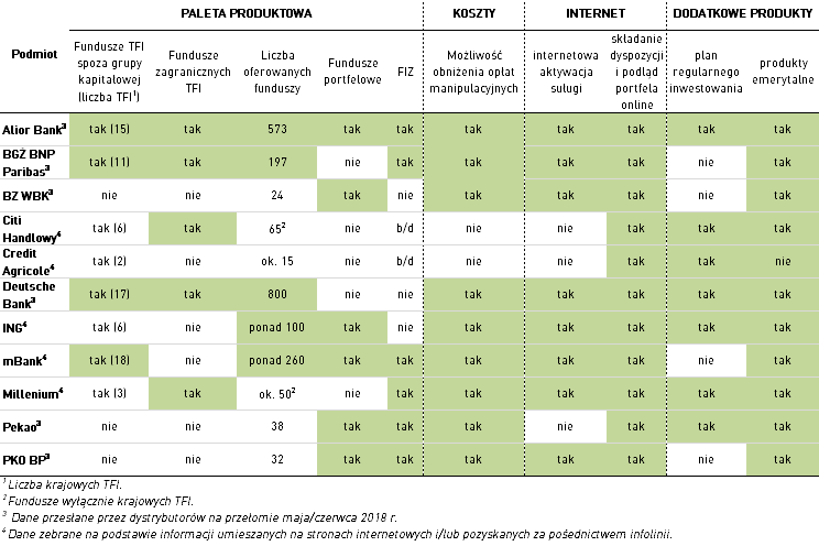 Na wyróżnienie zasługują także BGŻ BNP Paribas, Deutsche Bank i mBank, które również dysponują szeroką ofertą funduszy. Zaletą jest również „internetowość” procesu inwestowania i możliwość skorzystania z preferencyjnych opłat. Co prawda w gronie tym jedynie Deutsche Bank daje możliwość skorzystania z planu regularnego inwestowania, za to wszystkie wspomniane banki oferują klientom produkty emerytalne.