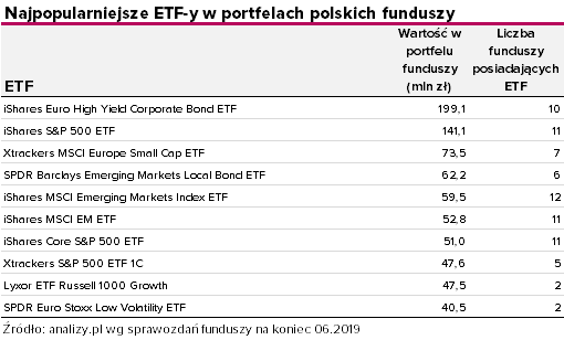 Fundusze typu ETF (exchanged traded fund) są coraz częstszym wyborem zarządzających. W sprawozdaniach funduszy na koniec czerwca 2019 roku wystąpiło 212 różnych ETF-ów, a ich aktywa wyniosły ponad 1,9 mld zł. To wprawdzie wciąż mniej niż jeden procent wszystkich aktywów zgromadzonych w funduszach, jednak zarówno w naszym kraju, jak i na świecie widać rosnące zainteresowanie funduszami typu ETF. Morningstar poinformował, że po raz pierwszy w historii aktywa w funduszach pasywnych i ETF-ów na amerykański rynek akcji były warte więcej niż te w funduszach zarządzanych aktywnie.