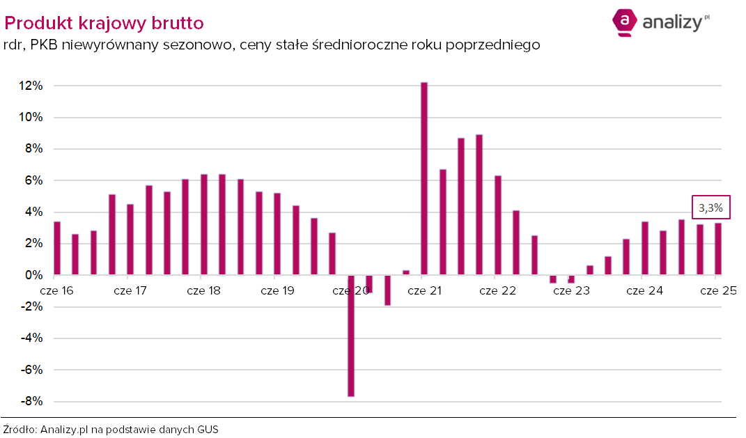 W II kwartale 2025 roku polska gospodarka urosła według zrewidowanych w październiku danych Głównego Urzędu Statystycznego o 3,3% rok do roku. To o 0,1 pkt proc.mniej, niż wynikało z wcześniejszych odczytów, a przyczyną tej korekty w dół była zmina bazy odnisienia, czyli korekta w górę odczytów za 2024 rok. Przypomnijmy, że w I kwartale 2025 roku PKB zwiększyło się o 3,2%.