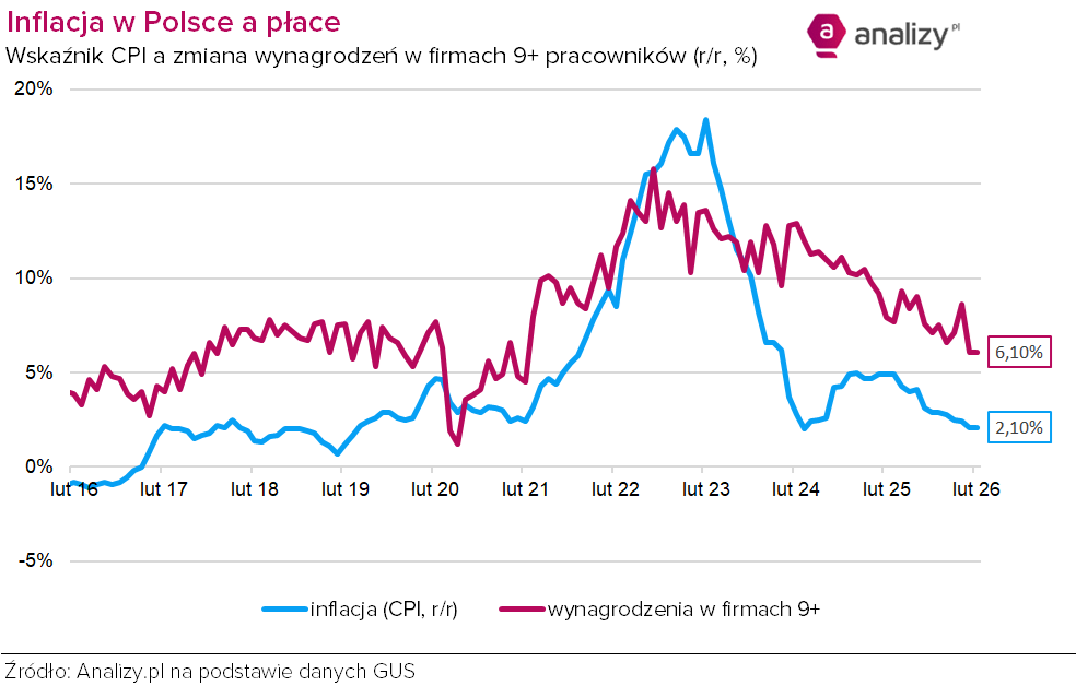 W lutym 2026 roku przeciętne miesięczne wynagrodzenie brutto w sektorze przedsiębiorstw wyniosło 9135,69 zł, tj. wzrosło nominalnie o 6,1% w porównaniu ze styczniem poprzedniego roku. To ponownie wzrost słabszy, niż zakładał konsensus (6,6%), i taki sam jak w styczniu. Zarazem to drugi słabszy odczyt po dwóch z rzędu wyraźnie powyżej prognoz.